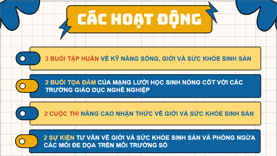 1. 03 buổi tập huấn chuyên sâu về kỹ năng sống, giới và sức khỏe sinh sản.