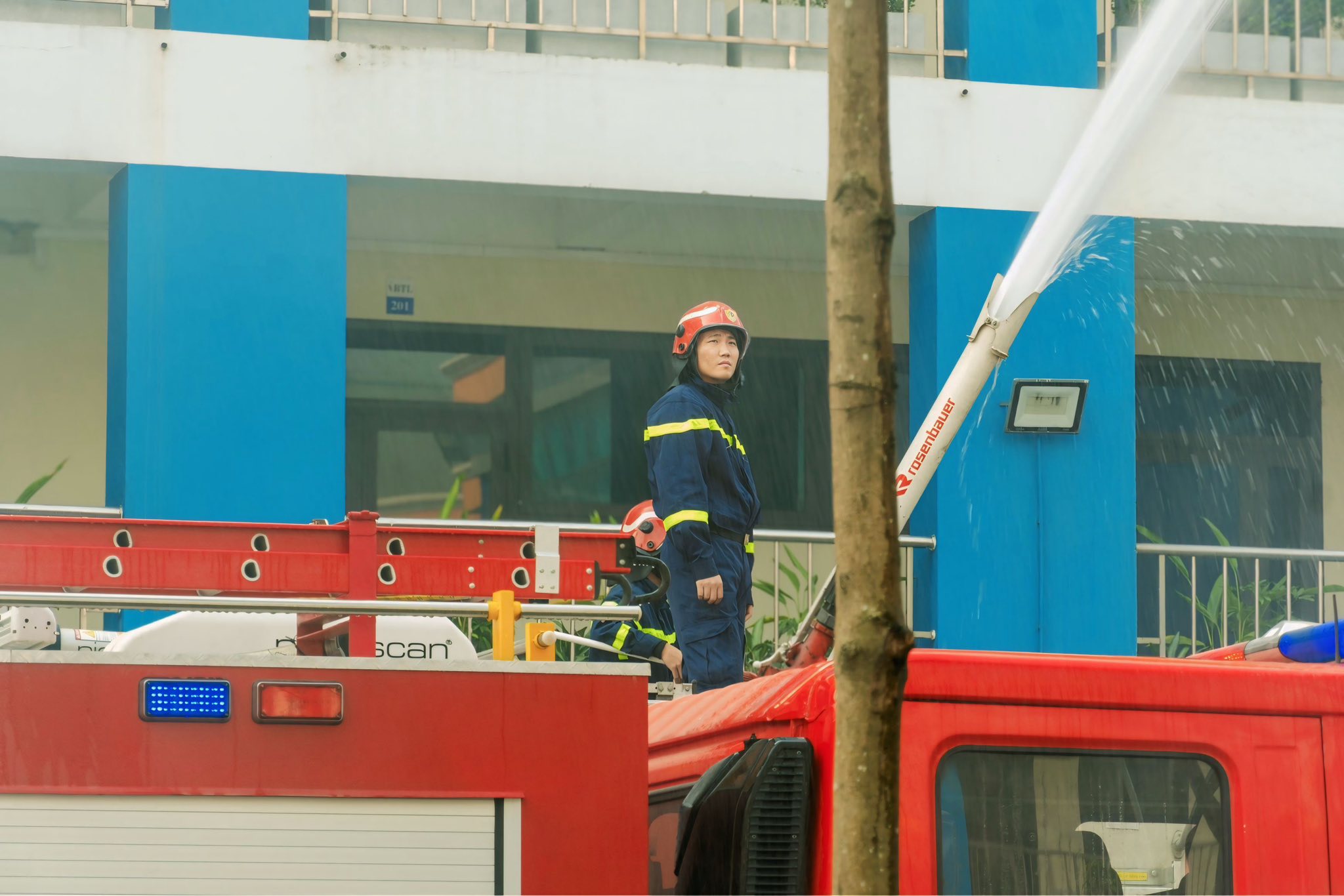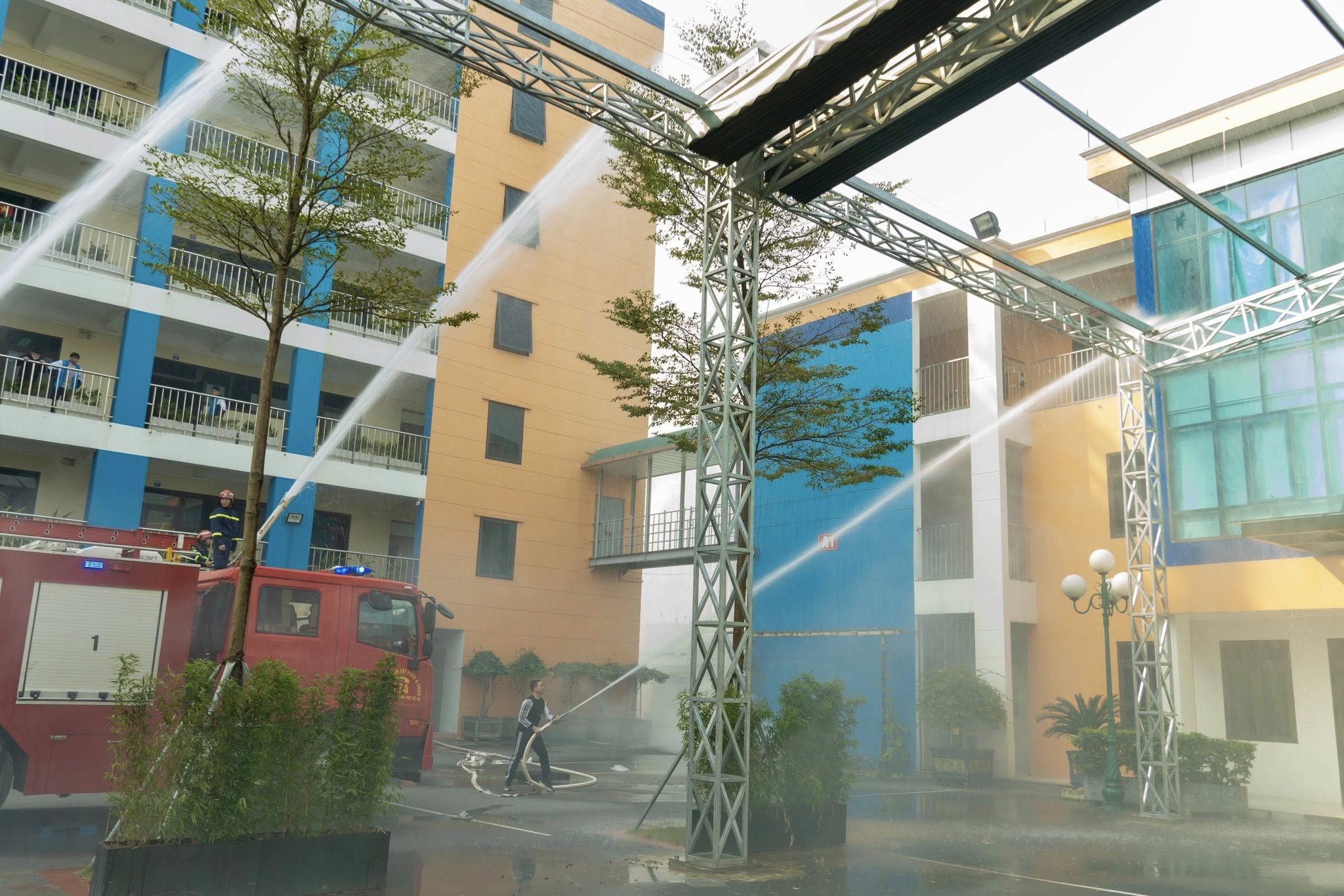 Song song với đó, lực lượng Cảnh sát PCCC & CNCH đã điều động xe chữa cháy chuyên dụng đến hiện trường, triển khai đội hình phun nước dập lửa và thực hiện công tác cứu nạn, cứu hộ theo đúng quy trình nghiệp vụ. Hoạt động diễn tập được tổ chức bài bản, nghiêm túc, sát với tình huống thực tế, giúp cán bộ, giáo viên, nhân viên có cái nhìn trực quan và rèn luyện kỹ năng ứng phó trong môi trường có áp lực cao.